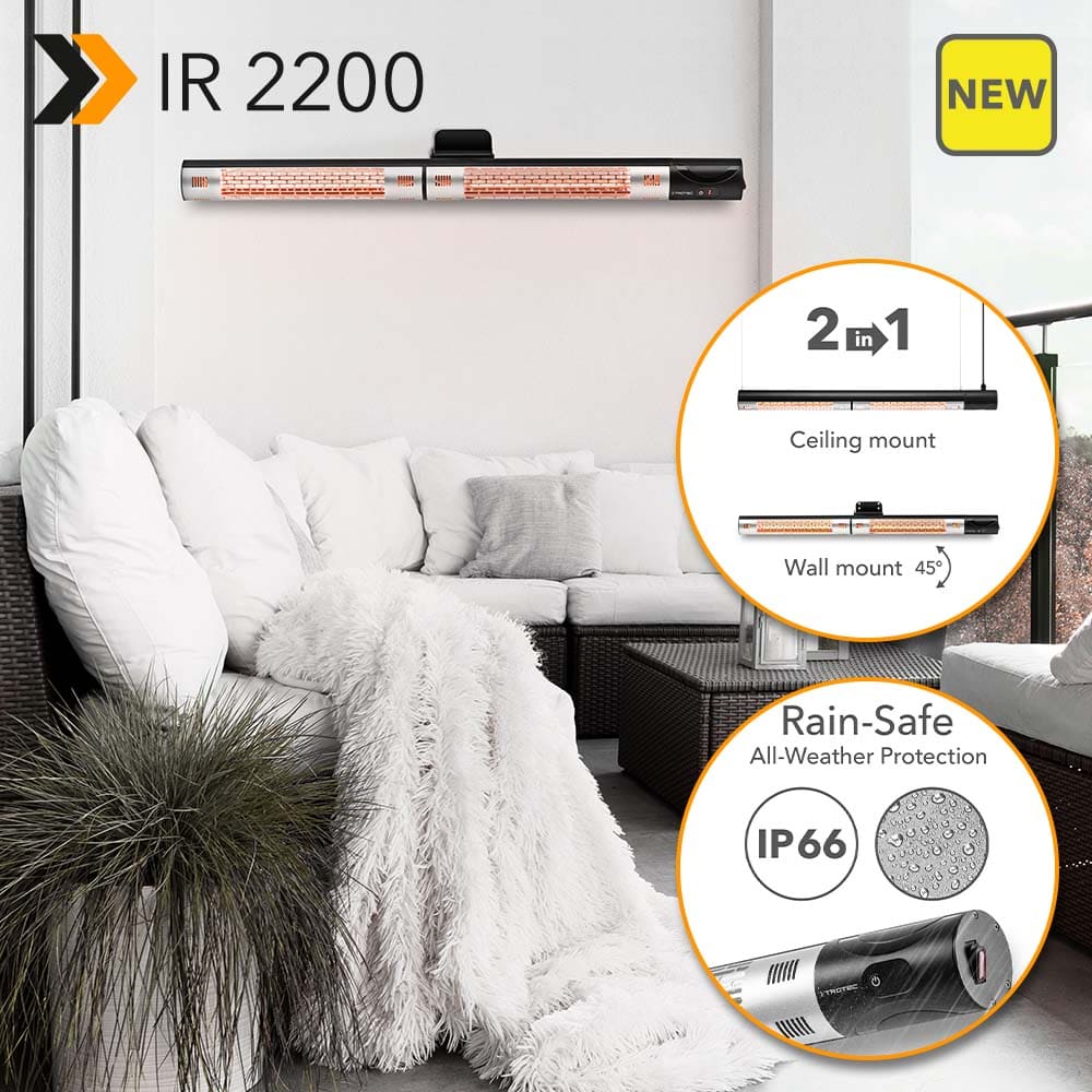 Currently, during the pandemic, enjoying some fresh air on the own terrace or balcony is the preferred choice for those that have that opportunity. But quite often, time outside is limited to a few minutes due to the freezing cold. That is, if you don´t dress your winter clothes every time you want to go outside for a few minutes. The more convenient option is to provide cosy direct heat on your terrace with just a push of a button: Because the new infra-red radiant heater IR 2200 comes with a remote control, with 2,200 W heating power as well as the wall and elegant ceiling mountings supplied – and impresses with other outstanding solutions, both visually and thermally!