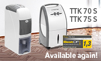 Sold out for quite some time, now available again: two of our most popular dehumidifiers are available again as of today – and at real bargain prices! Inform yourself now as to which of the two dehumidifiers meets your requirements best: Our model TTK 70 S with its compact design and laundry dehumidification function or our TTK 75 S, chosen for the sought-after product award “Best of 2014”. Or do you even need both? It’s your decision!