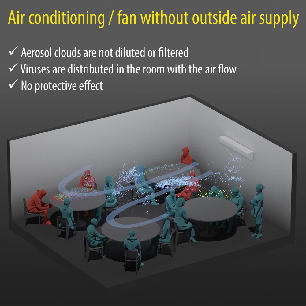 • The air blown out by the air conditioning unit distributes virus-carrying aerosols into the most remote corners of the room where they are inhaled despite the minimum distance being maintained.