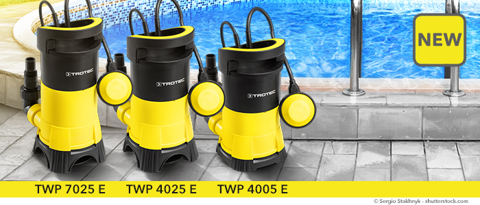 The new immersion pumps are ideally suited for versatile applications in clean to severely contaminated water, such as withdrawing water from lakes, ponds and rivers, transferring or pumping water out of a pool, pond, cistern, or rain barrel or for draining out a flooded cellar. Our clear water immersion pump TWP 4005 E serves for effective drainage and transfer of clean or only mildly contaminated water with dirt particles up to a diameter of 5 mm. Our waste water immersion pumps TWP 4025 E and TWP 7025 E can handle severely contaminated water as well – here particles can be up to 25 mm in diameter. It’s best if we briefly dive into the different advantages of the two types of pumps together – come now, the water’s not that cold…