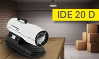 The new IDE 20 D Oil-Fired Heater has been made in a much more compact design, which means the device is even easier to handle. An on top of that, there is the advantage of increased mobility. The operation concept however remains exactly the same with the new IDE 20 D: good value, reliable and direct on-site heating. With heat output of 20 kW the device only needs around 1.2 litres of oil per hour!