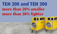 Of course both electric heaters combine the entirely smoke-, flame- and condensate-free generation of hot air. Even though they hardly differ in appearance and in their operating functions, they do clearly differ from each other in their performance parameters. The TEH 200 produces a massive heat output of 40 kW and produces up to 3,000 m³ hot air per hour. The TEH 300 tops this performance again with an 80 kW heat output and hot air production of 6,000 m³. Both heaters now boast compact dimensions of 1,625 x 800 x 1,245 mm (l x w x h) and a weight of only 230 kg (TEH 200) or 250 kg (TEH 300).