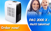 The new air conditioner PAC 2000 X offers you all possibilities of a pleasant room climate. Intended to cool the room in the first place, furthermore it filters and dehumidifies the air, and besides it can be used as heating at cold winter days. Additionally the operating mode ‘ventilate’ provides the option, to just circulate the room air without cooling.