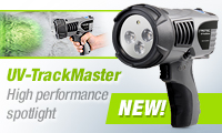 With its economical designed pistol grip for extensive illumination designed, the UV-TrackMaster is ready for action right away. The high radiation strength makes the smallest tracer paths visible, even at daylight and long distance. That’s why with this device you don’t have to neither shorten the distance, nor darken the light. You can switch it on and off easily by pushing a button on the pistol grip. In poorly lit areas you can switch on the separately connectible LED high performance orientation light for help. For only 1,184.05 Euros the UV-TrackMaster will shortly be yours!