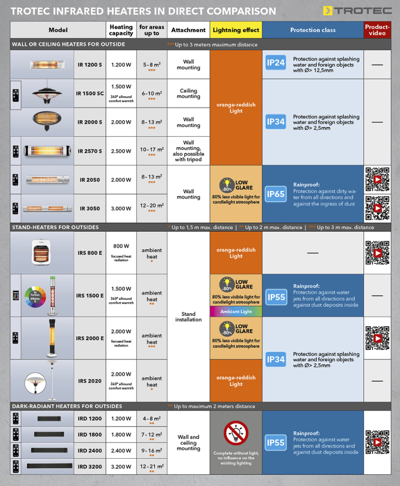 At Trotec you will always find exactly the right infrared radiant heater for your patio, one that meets all your requirements. The best way to convince yourself of our extensive product range is to take a look at the following overview of our product range. You will find everything you need to know about each individual infrared heater, from the heating output and area coverage, to mounting options, light effects and protection classes. Clearly arranged according to our four IR series.
