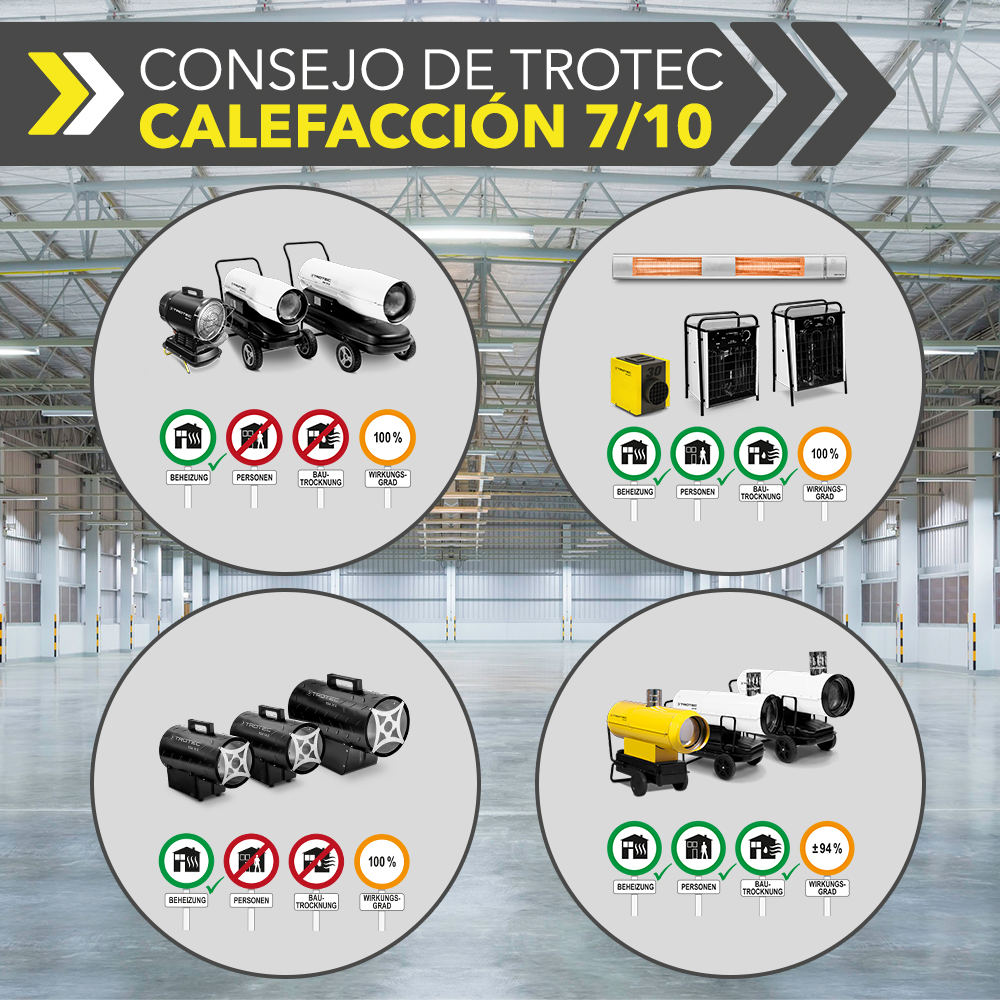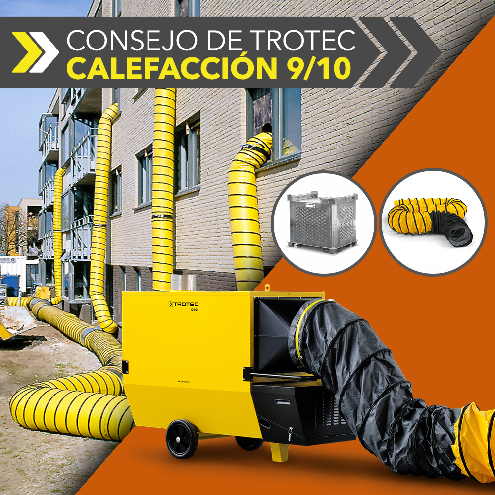 Es habitual que los calefactores de gasóleo con una potencia superior a 100 kW, debido a su tamaño, se coloquen en el exterior delante del edificio al que se desea proporcional calefacción- Ya sea para la ventilación, calefacción, secado, climatización o aspiración, cada unidad es tan eficiente cono el eslabón más débil de la cadena de los componentes usados. Es por eso por lo que incluso al elegir los accesorios como, por ejemplo, los sistemas de circulación de aire y los depósitos de almacenamiento, no debe conformarse, sino también a este respecto confiar en la calidad de la marca Trotec probada en múltiples ocasiones.