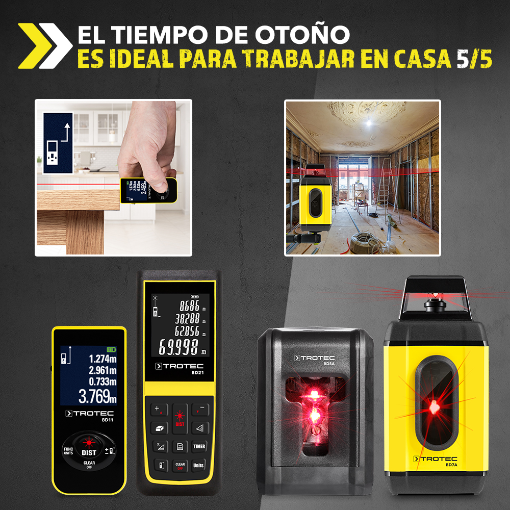 Quien quiera utilizar el tiempo de otoño para reparaciones y mejoras en toda la casa y el jardín, merece todo el apoyo. Trotec sabe que, además de herramientas fiables, los apasionados del bricolaje también necesitan instrumentos de medición para obtener resultados sin errores en la medición de distancias y en el trabajo de nivelación. En el último capítulo de nuestra serie «Otoño: tiempo de bricolaje» recomendamos distanciómetros láser: precisos, fáciles de manejar e insuperablemente económicos. Calidad de la marca Trotec, porque lo bueno no tiene por qué ser caro.