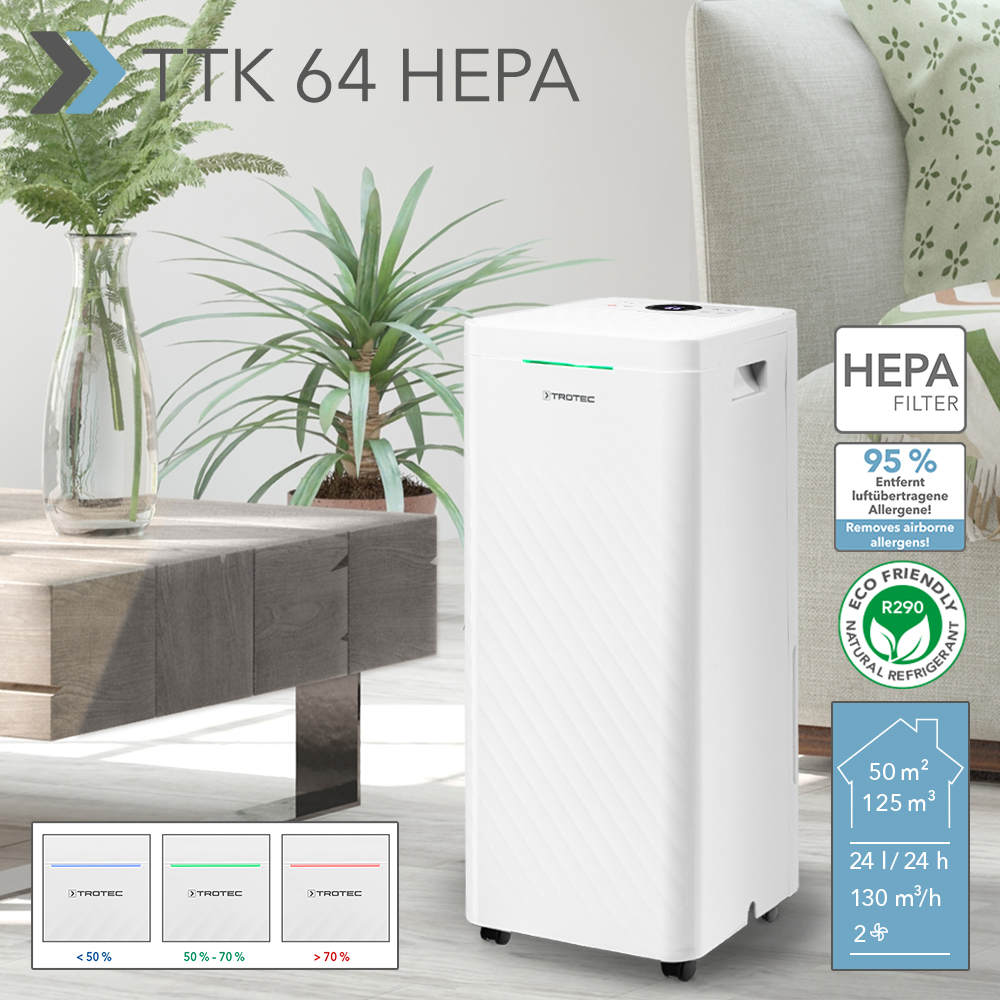 Mientras los expertos en salud siguen advirtiendo de los riesgos del moho provocado por el exceso de humedad en los interiores, surge ya la siguiente alarma: ¡el polen vuelve al ataque! Un peligroso contaminante del aire no sólo para alérgicos y asmáticos, sino también para todos aquellos que padecen enfermedades respiratorias. Por eso es genial que el elegante deshumidificador y purificador de aire TTK 64 HEPA haya llegado a tiempo: deshumidificador de 24 litros y purificador de aire HEPA en un solo aparato, que elimina el 95 % de las esporas de moho y polen patógenos, así como otros agentes contaminantes del aire de su habitación. ¡Y respire a gusto!