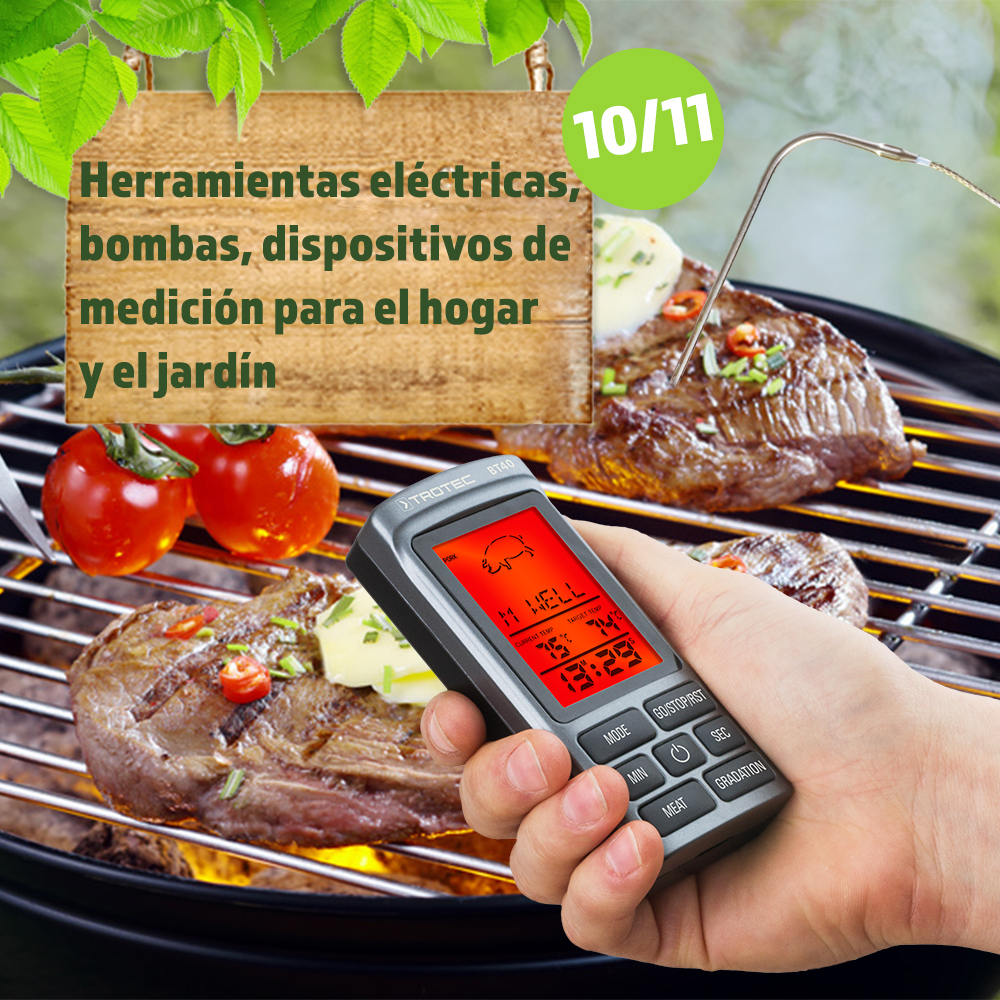 Hasta ahora: Quien fuera el maestro de la barbacoa en el jardín o en los fogones de su casa, no podía apartar los ojos de las salchichas o del chuletón, y mucho menos de la noble pieza de solomillo ni un minuto, mejor dicho, ni un segundo. Y tampoco distraerse con charlas poco profesionales con los invitados. Pero ahora se puede, y de hecho se debe, reescribir la historia del éxito de las barbacoas: Gracias al termómetro inalámbrico de barbacoa BT40 de Trotec podrá disfrutar, tanto usted como sus invitados, de platos de carne perfectamente preparados sin tener que estar todo el tiempo junto a los fogones o la barbacoa.