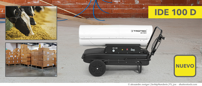 Por mucho frío, hielo y nieve que traiga el invierno, con el nuevo soplador calefactor de fueloil IDE 100 D ya disponible, usted y sus empleados tendrán siempre los pies bien calentitos, tanto en la obra como en el almacén. De eso se encargan los 100 kW de potencia calorífica directa máxima de esta profesional y económica solución. Esto se traduce en una efectividad ni más ni menos que del 100 %. Con esta extraordinaria capacidad de calefacción, este calefactor tan eficaz protege el ganado frente al frío y evita la congelación de los materiales de trabajo, entre otras cosas.