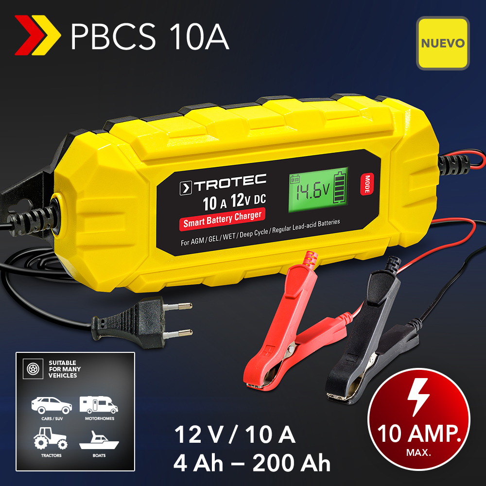 ¡Oh, no! ¡La batería no quiere arrancar! Ahora precisamente, en medio de una mudanza con el SUV o la furgoneta. En el centro histórico con la autocaravana. En medio del campo con el tractor o en medio del lago con el barco a motor… Quien quiera evitar este tipo de situaciones, debería echar un vistazo al cargador de batería PBCS 10A: controlado por procesador con ciclo de carga de 10 niveles, con corriente de carga de 10 amperios y pantalla LC retroiluminada. Y gracias a su excelente equipamiento completo, nuestra principal recomendación para cuidar de su batería de 12 V entre 4 Ah y 200Ah. Perfecto, por ejemplo, para turismos/SUV, tractores, barcos a motor, autocaravanas y furgonetas.