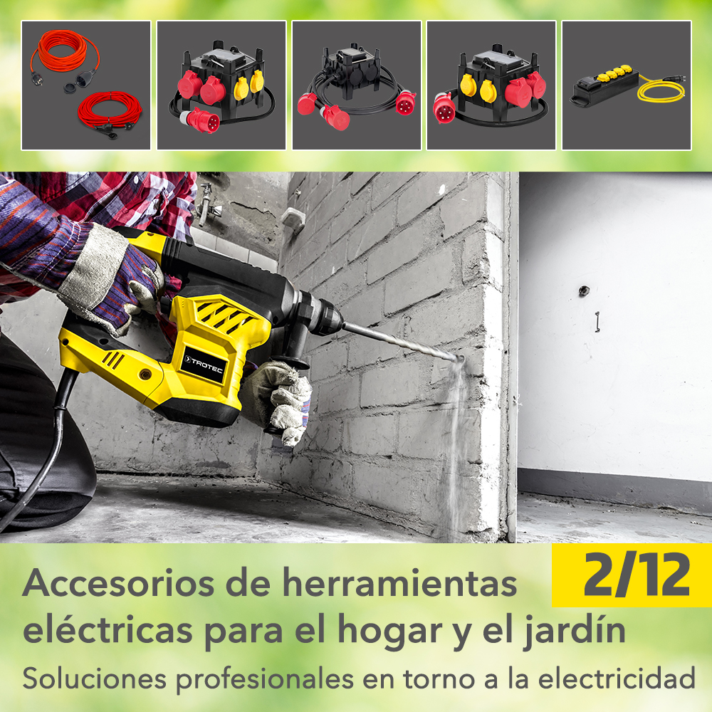 Hoy hablaremos de accesorios para herramientas eléctricas, a menudo subestimados: el supuestamente simple cable alargador y el profesional distribuidor móvil de corriente o la regleta de enchufes. Es habitual darse cuenta de que nos hacen falta en el último momento, normalmente justo antes de comenzar los trabajos planeados. ¡Demasiado tarde! Por este motivo, compruebe antes de usar sus dispositivos eléctricos si realmente tiene todos los accesorios necesarios. Por cierto, ni los cables alargadores ni los distribuidores de corriente móviles de Trotec son realmente simples: Con estas robustas herramientas profesionales aumentará el alcance de sus herramientas eléctricas. Y todas están protegidas conforme al tipo de protección IP44 (regleta de enchufes: tipo de protección IP54) frente a las salpicaduras de agua y, por lo tanto, son adecuadas para obras y jardines.