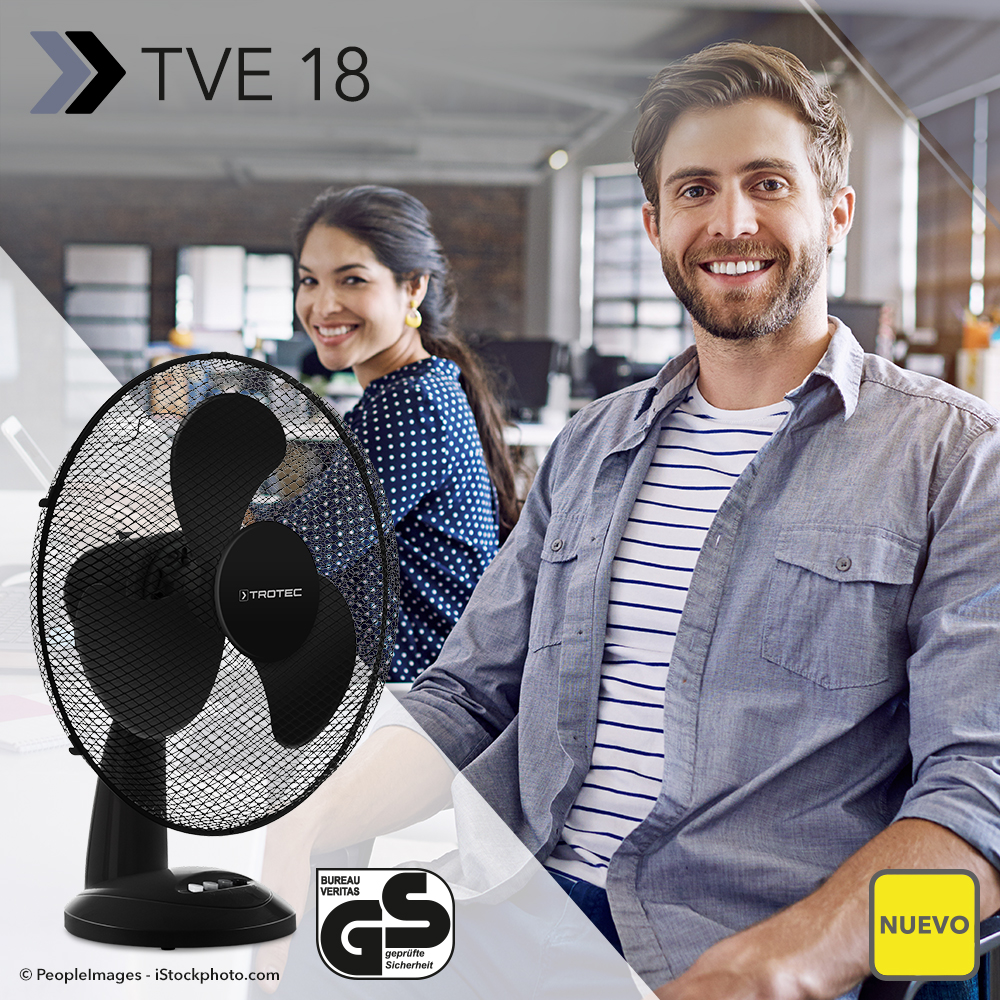 ¡Un momento! ¡Aguante un momento el calor aplastante! El ventilador estable TVE 18 S ya va camino de su casa. Ya solo es cuestión de realizar un par de maniobras: abrir la caja, enchufar el ventilador y encenderlo. ¡Y a disfrutar del fresquito! Pero si usted es una de las pocas personas a las que se les ha pasado nuestra oferta hasta ahora, no tendrá que lamentarse durante mucho más tiempo: muévase poco, quédese a la sombra y simplemente, pídalo. ¡El gran frescor acudirá a usted!
