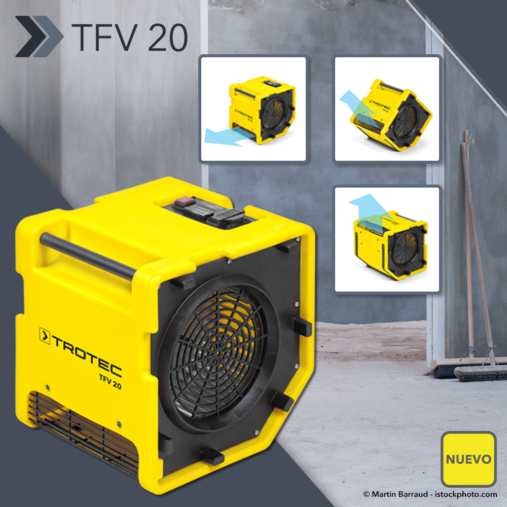 Junto a los dos ventiladores turbo TFV 10 y TFV 30 que había hasta el momento, ahora llega la nueva clase con el TFV 20. Con una potencia de aire máxima de 1.185 m³/h, este ventilador sienta nuevas bases para la ventilación en seco. Salta a la vista que el TFV 20 es una buena solución para hacer circular grandes volúmenes de aire en muchos trabajos de carácter profesional, pues este ventilador radial solo adquirible en Trotec destaca no solo por el diseño industrial tipo alemán totalmente práctico, sino especialmente por la potencia y la larga vida útil.