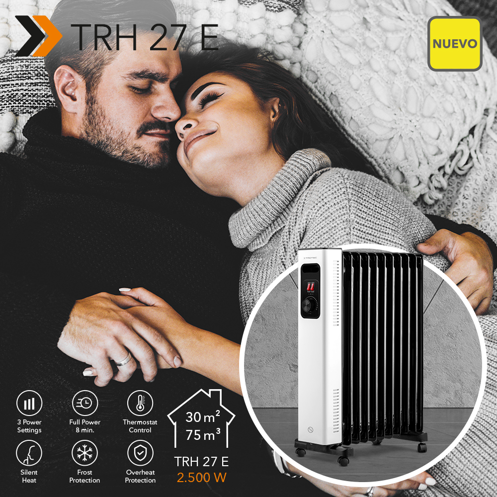 Cuidado: el invierno está lejos de terminar. Y después de los días fríos, aún nos espera el largo periodo de transición fresco. Por ello, el radiador de aceite TRH 27 E, móvil y finalmente disponible, se recomienda como un eficaz calefactor de respuesta rápida frente a olas de frío inesperadas, así como una fuente de calor fiable incluso fuera de la temporada de calefacción habitual. Porque el radiador sólo necesita 8 minutos de calentamiento para alcanzar su máxima potencia calorífica, y regula la potencia calorífica y el consumo de energía de forma totalmente automática. Cómo mantener los costes de calefacción bajo control.