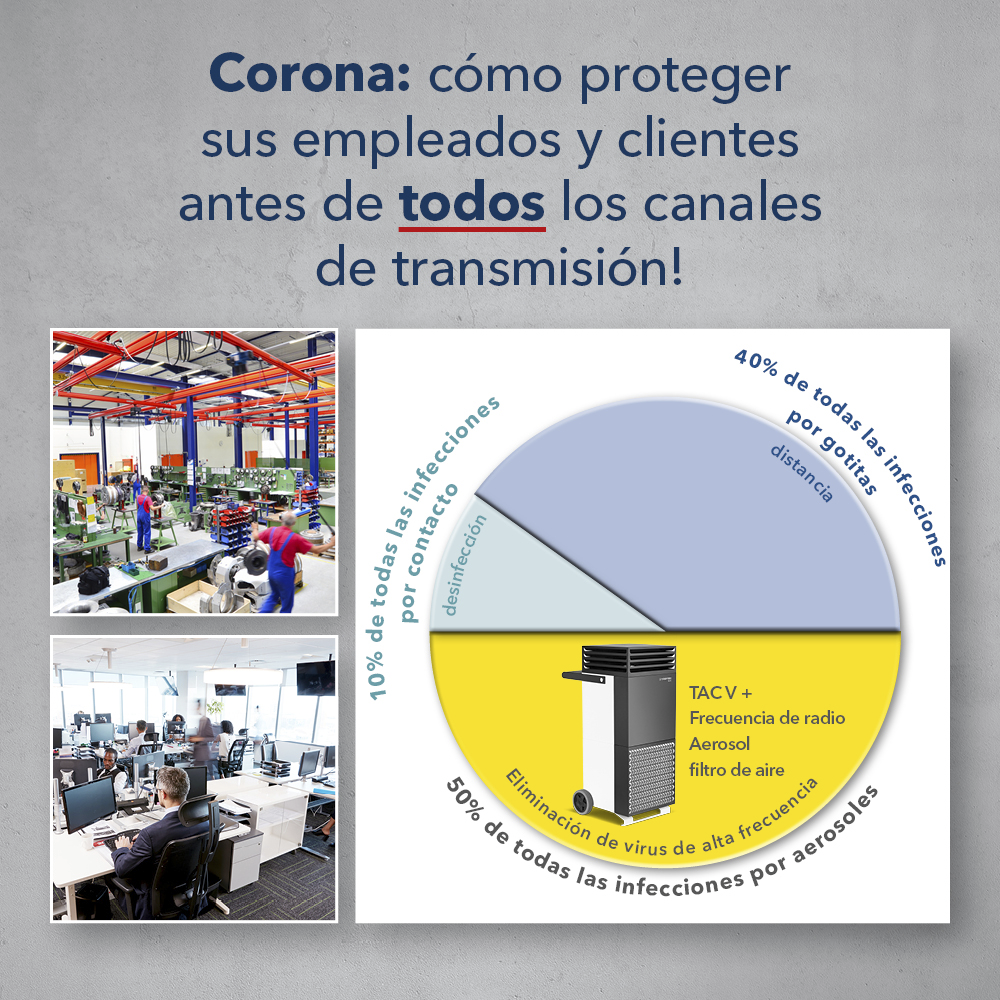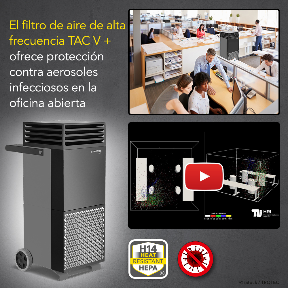 Los aerosoles y las pequeñas gotas se consideran, junto con la infección por contacto, los principales focos de transmisión del coronavirus, confirman los científicos y virólogos. Todos hablan sobre la desinfección, las distancias de seguridad, el uso obligatorio de la mascarilla o las paredes de separación de plexiglás. Pero, hasta ahora, en la percepción pública prácticamente no se ha hablado sobre soluciones de protección frente al mayor de todos los riesgos de contagio: la infección por el aire mediante aerosoles. Una de cada dos infecciones tiene lugar por esta vía de transmisión. Trotec se dispone a cerrar ya mismo este espacio en los conceptos de protección: mediante el purificador de aire de alta frecuencia TAC V+ con una innovadora tecnología de filtrado se completan los conceptos de higiene para la protección frente a los aerosoles transportados por el aire.