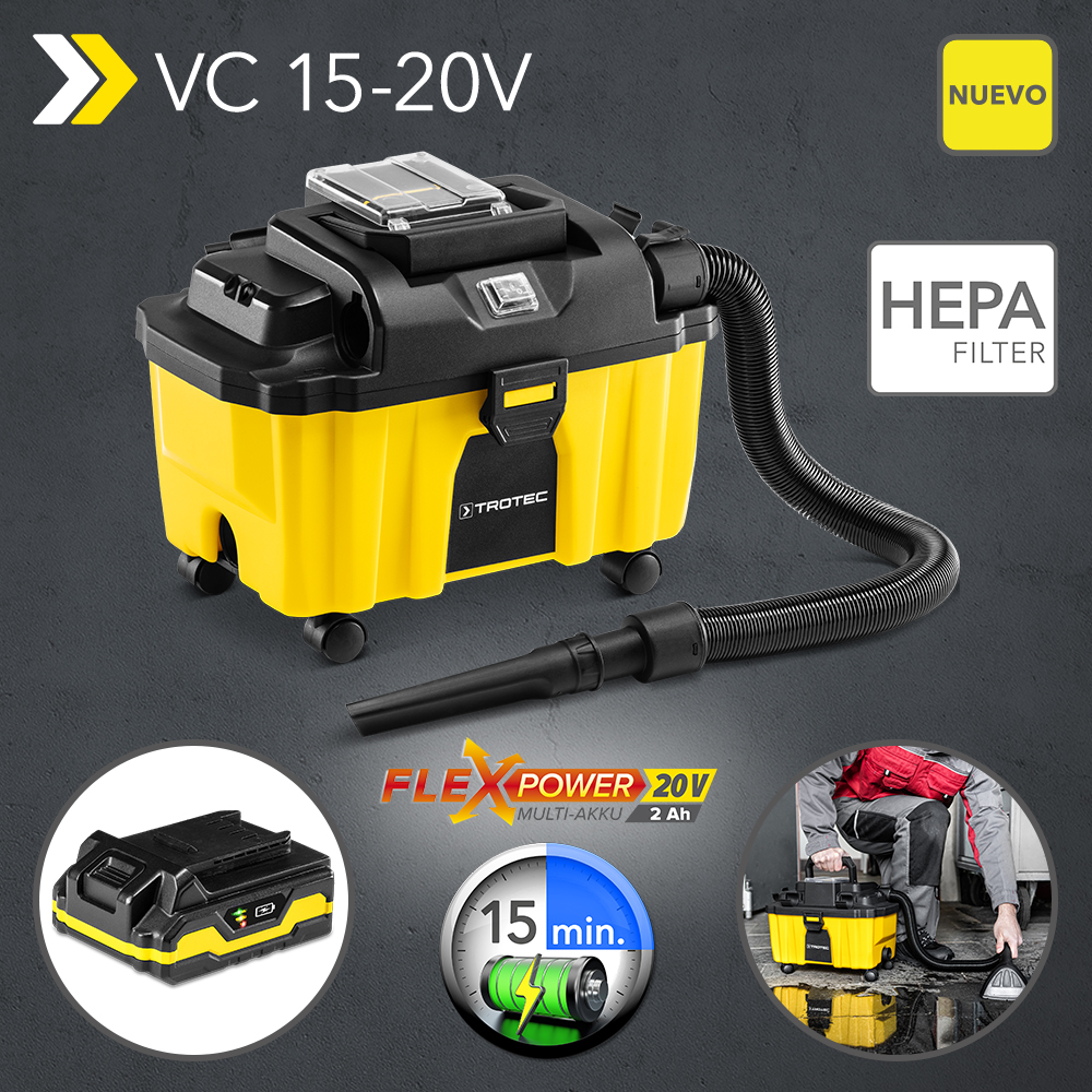 Da gusto poder trabajar en un lugar de trabajo limpio ya sea en el taller o en la obra. Ahora, en lugar de tener que eliminar a mano el polvo, la suciedad, las virutas y los líquidos derramados, podrá limpiarlos en un instante con la aspiradora de mano a batería VC 15-20V. Sin enchufes ni cables. Y lo mejor de todo: la aspiradora con batería elimina las partículas finas de polvo y las virutas que salen de la herramienta durante el taladrado, el rectificado o el fresado, y las succiona directamente en su contenedor de recogida de 10 litros. Además, el filtro HEPA integrado impide que las partículas de polvo aspiradas retornen de nuevo al aire ambiente y sean inhaladas.