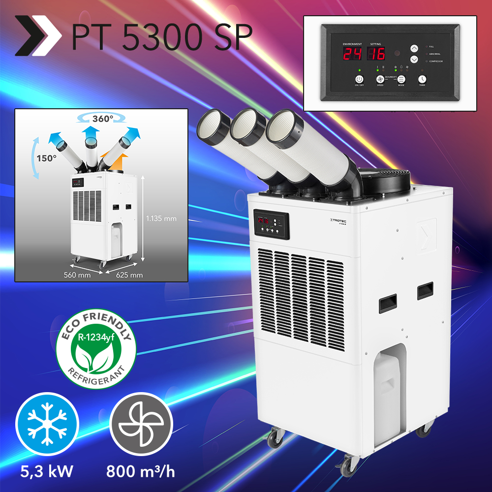 En muchos talleres e industrias, las altas temperaturas ambientales son prácticamente algo habitual dentro del proceso de producción y fabricación. Pero, a la larga, el estrés térmico permanente perjudica tanto el bienestar de sus empleados como el funcionamiento de los equipos mecánicos. Por ello, justo a tiempo antes de que lleguen las primeras olas de calor, le presentamos la solución ideal para crear un ambiente de trabajo fresco: el aire acondicionado portátil PT 5300 SP con 5,3 kW de potencia de refrigeración. Podrá refrigerar tres zonas de trabajo al mismo tiempo. Descubra lo fácil que es.
