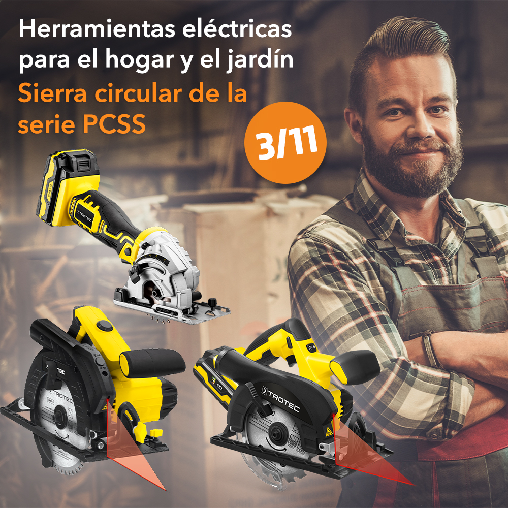 Los apasionados del bricolaje prácticamente cuentan con la sierra circular portátil como parte de su equipo básico. Tanto en el montaje de muebles como en la colocación de laminados o en el corte de encimeras de cocina a medida, los cortes largos y angulares de los paneles son necesarios en todas partes. Y esto se puede llevar a cabo de forma limpia y profesional con una sierra circular portátil. Trotec le ofrece tres convincentes dispositivos de alta gama: la minisierra circular portátil a batería PCSS 05‑20V, la sierra circular portátil a batería PCSS 10‑20V y la sierra circular portátil PCSS 10-1400. Y uno de estos modelos de alta gama se adaptará perfectamente a sus necesidades. ¡Prometido!