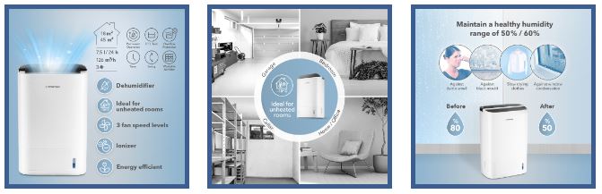 • Deshumidificación con tecnología de adsorción – ideal para habitaciones sin calefacción y entornos a baja temperatura hasta -10 °C