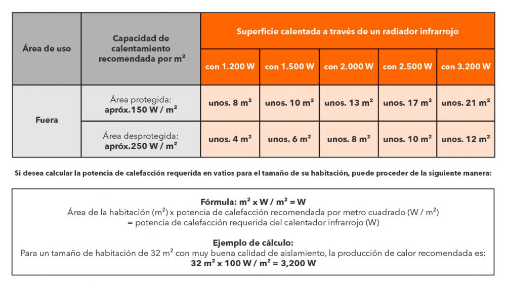 Superficie de la terraza (m²) x potencia de calefacción recomendada por metro cuadrado (W/m²) = potencia de calefacción necesaria del calefactor por infrarrojos (W)