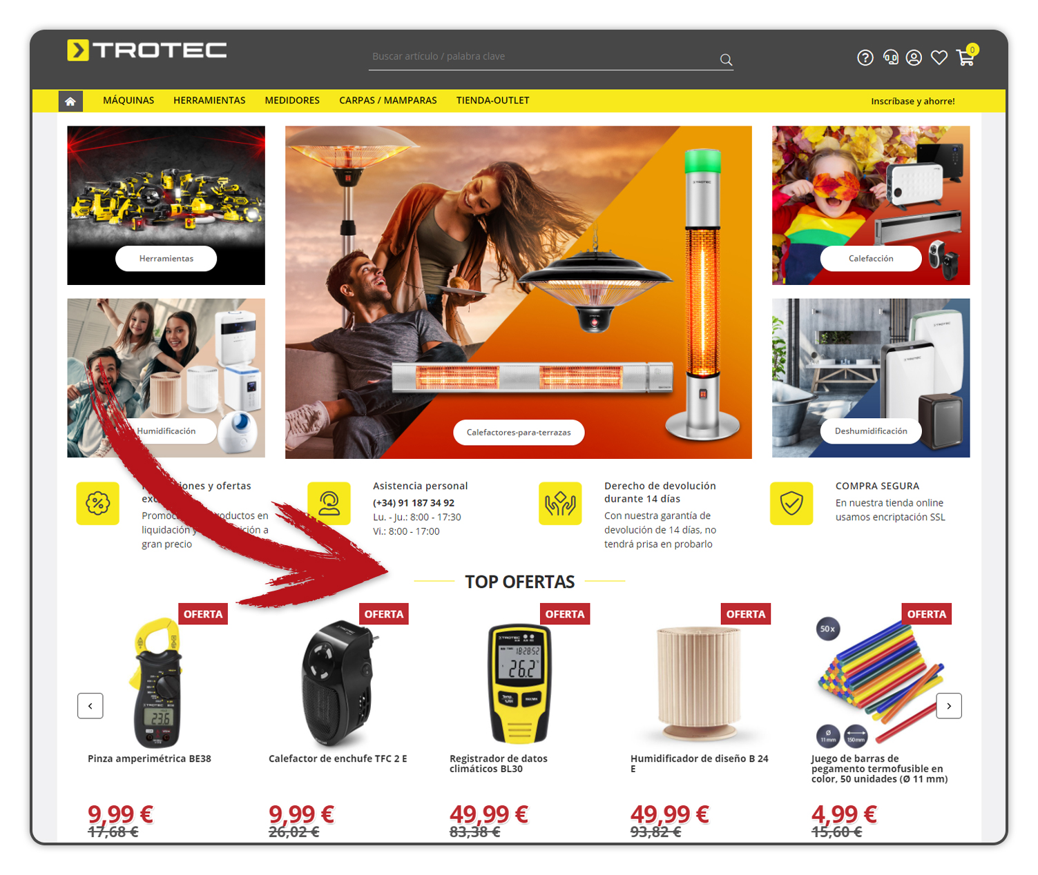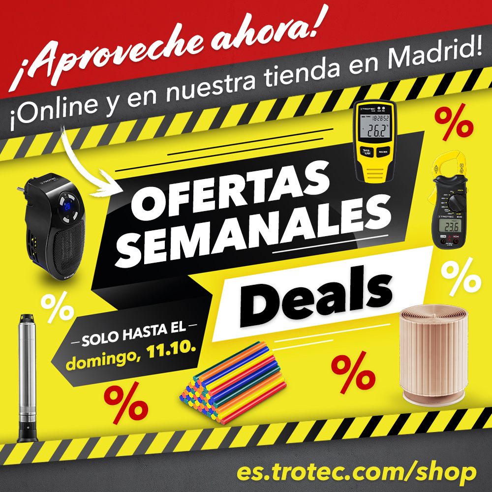 Todas las «MEJORES OFERTAS» se muestran en nuestra página web, en la tienda online https://es.trotec.com/shop Basta con navegar con las flechas de «derecha» e «izquierda» y encontrará todas las ofertas actuales.