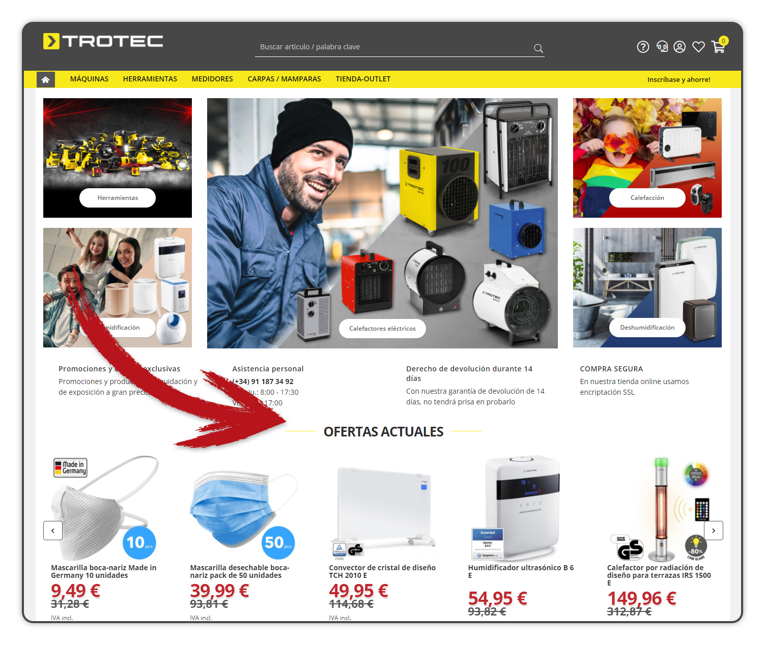 PUEDE ENCONTRAR SUS OFERTAS EN NUESTRA TIENDA ONLINE:Todas las «MEJORES OFERTAS» se muestran en nuestra página web, en la tienda online https://es.trotec.com/shop Basta con navegar con las flechas de «derecha» e «izquierda» y encontrará todas las ofertas actuales. |