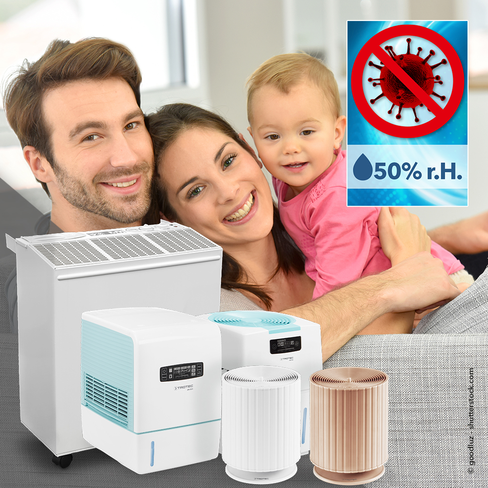 ¿A qué se debe esto? Las personas enfermas emiten una gran cantidad de virus al respirar, hablar, toser y estornudar que se incrustan en un abrigo de agua de mucosa bronquial, saliva y sales disueltas, los denominados aerosoles. Estas pequeñas gotas infecciosas contienen casi el 100 % de saturación de agua al abandonar las vías respiratorias. La humedad respectiva del lugar decide qué sucederá con esta mezcla tóxica concentrada y, ¡naturalmente usted, ya que puede cambiarla a su favor con la ayuda del humidificador de aire de Trotec de forma muy sencilla!