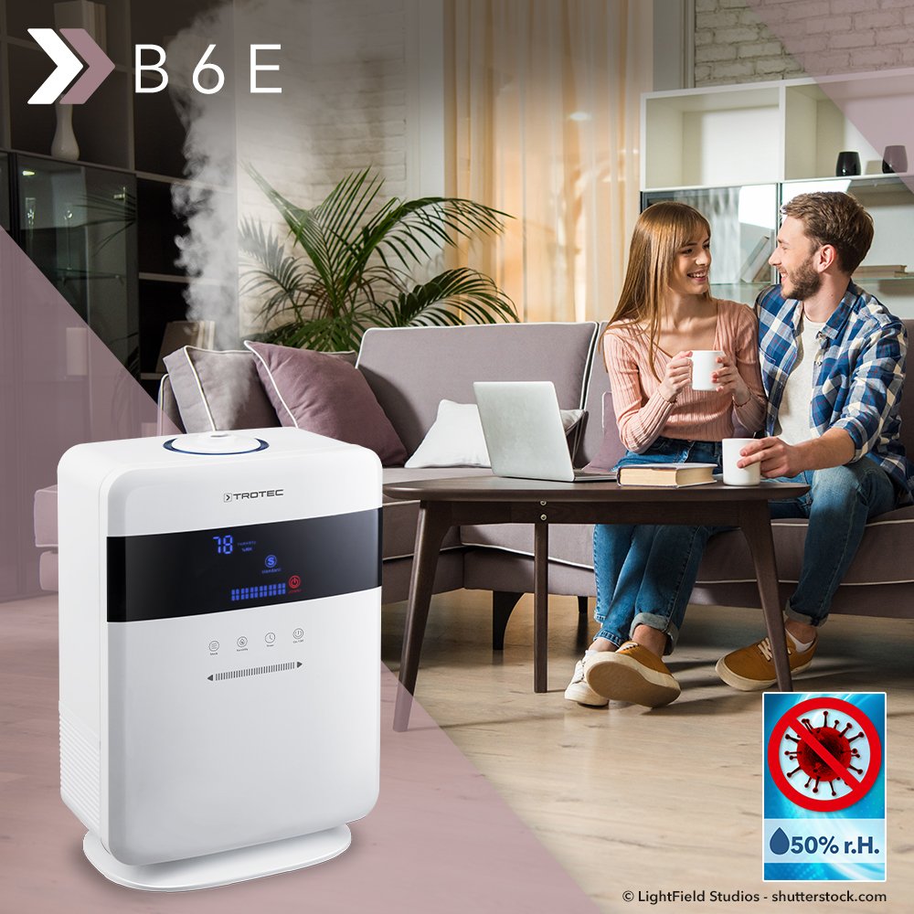 Las personas, los animales y las plantas se benefician por igual de la mejora de la calidad del aire gracias a una refrescante pulverización producida por el humidificador B 6 E mediante ultrasonidos: Las plantas de maceta florecen, las mascotas gozan de mayor vitalidad y el riesgo de resfriados y transmisión de virus en los humanos disminuye. Este es el resultado constante de recientes investigaciones científicas, que han demostrado que un nivel de humedad del 50 % reduce significativamente el carácter infeccioso de los virus y el riesgo de transmisión. Cuando una persona infectada tose o estornuda y sus patógenos se quedan en un aire humidificado de forma óptima con una humedad relativa del 40 al 60 %, la concentración de sal dentro de la gota cambia de tal manera que el patógeno es eliminado inmediatamente después del contacto con el aire.