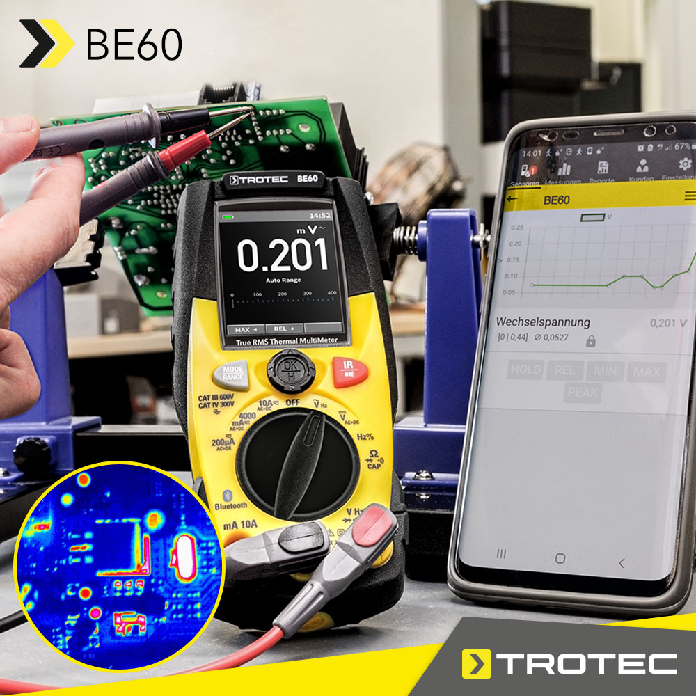 Benefíciese de la calidad de la marca Trotec como garantía de alto valor, seguridad y funcionalidad. Infórmese hoy mismo sobre el nuevo multímetro digital True RMS BE60 y su precio de oferta actual. ¡Ya en la tienda Trotec!