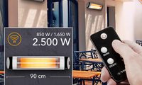 Por otro lado, el calefactor por infrarrojos dispone de una pantalla de LED, una luz de control y una función de temporizador de 24 horas que le permitirá programar cómodamente el tiempo de funcionamiento del radiador en franjas de una hora. El aparato se apaga automáticamente cuando llega la hora configurada y consigue así ahorrar energía. El calefactor puede montarse en la pared de espacios exteriores cubiertos y está protegido por todos lados del polvo y las salpicaduras según el grado de protección IP34. Como es de esperar, el soporte necesario para colgarlo en la pared viene incluido en el suministro. Otro accesorio que puede suministrarse opcionalmente es el trípode telescópico, que permite colocar el calefactor como modelo autónomo con aún más flexibilidad. Así se amplía todavía más el radio de uso de 900 mm del radiador y puede utilizarse temporalmente también en espacios exteriores descubiertos.