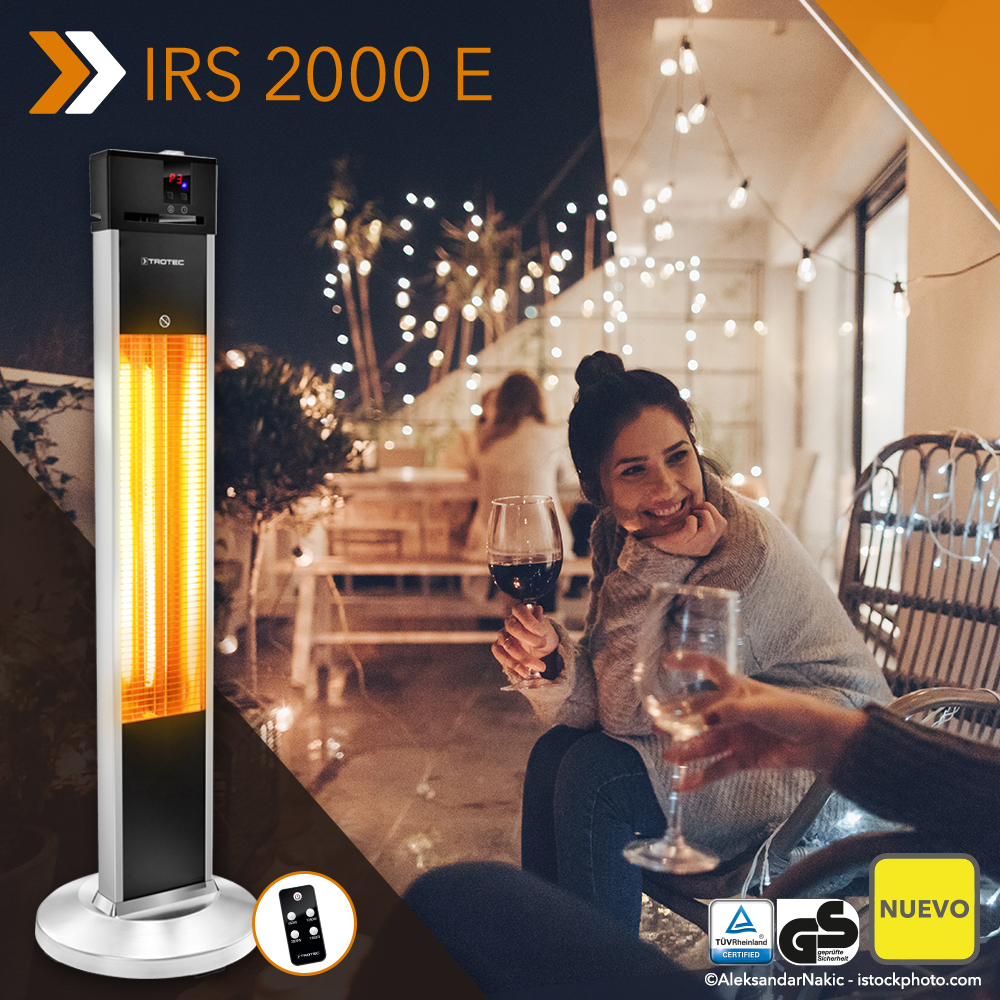 Quien desee disfrutar también a finales de otoño de su balcón o terraza ante un agradable calor, es mejor que se decida por nuestro nuevo calefactor por radiación infrarroja IRS 2000 E: el aparato cuenta con 2.000 W de potencia calorífica, y se puede regular cómodamente a distancia en 3 niveles. Y quien además valore una atmósfera perfecta y acogedora, debería decidirse nuevamente por el IRS 2000 E, pues en comparación con los radiadores por infrarrojos, este aparato ofrece una radiación luminosa reducida y hace que esta sea prácticamente antideslumbrante, con una disminución de hasta un 80 % e incluso a una potencia de calentamiento del 100 %, gracias a los tubos infrarrojos de ondas cortas Low Glare de alta calidad.