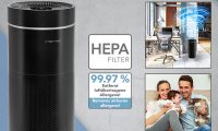 El purificador de aire móvil AirgoClean® 171 E marca nuevos estándares en la mejora de la calidad del aire ambiente con una tecnología de filtrado de carbono HEPA aún más eficiente con prefiltro DACRON®. Esto se debe a que elimina en su filtro HEPA de alta eficiencia hasta el 99,97 % de las partículas nocivas que se transportan por el aire con un tamaño de partícula de hasta 0,3 micrómetros. Virus, bacterias, esporas de moho y partículas de polvo fino, polen y alérgenos no tienen ninguna posibilidad de propagar el riesgo de infección en su hogar. Asimismo el elegante purificador de aire diseñado en negro mate funciona de forma totalmente automática gracias a unos sensores de calidad del aire de última generación que miden continuamente la calidad del aire ambiente y detectan los cambios para luego contrarrestarlos con una función de limpieza del aire controlada de forma inteligente. El ventilador regulable de cinco velocidades con una circulación de aire máxima de 350 m³/h mejora notablemente la calidad del aire en espacios de hasta 42 m².