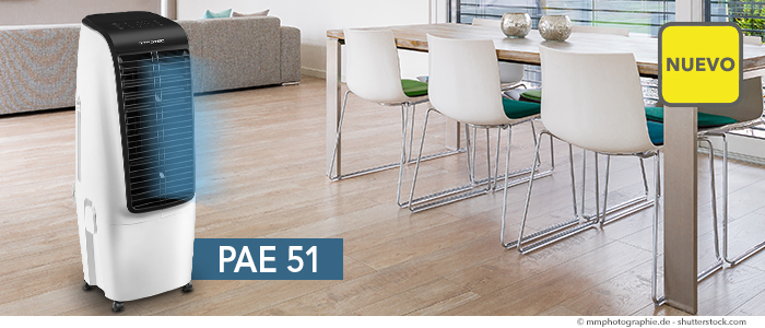 Por fin ha llegado: el nuevo refrigerador de aire PAE 51. La alternativa rentable al aire acondicionado se las arregla sin hacer uso de refrigerantes artificiales ni de mangueras de salida de aire. No obstante, el refrigerador de aire proporciona una agradable refrigeración de forma inmediata con solo apretar un botón, ya que emplea la refrigeración por evaporación natural. Y además, como aparato 4 en 1, ventila, refresca y humedece el aire aún más: gracias a su filtro de aire integrado se puede utilizar todo el año, ya sea como ambientador o como humidificador.