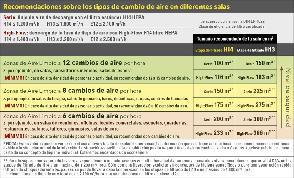 En contraposición a los purificadores de aire habituales que, debido a sus clase de filtro (< E10 – E12) y potencias de aire (< 500 m3) reducidas, se venden generalmente para el filtrado del aire ambiente de polvos, polen u olores, durante el desarrollo del purificador de aire TAC V+, el objetivo de la investigación fue la eliminación rápida de las mezclas de aerosoles infecciosas. Esto se debe a que el tiempo es el factor más importante para la reducción del riesgo de infección indirecto. Para diluir de forma inmediata las mezclas de aerosoles infecciosas en su lugar de origen y filtrar en pocos minutos las partículas de aerosoles cargadas de virus, el purificador de aire TAC V+ obtiene una cantidad de aire puro y una potencia de emisión para la obtención de una corriente de aire optimizada en el espacio inusitada hasta ahora.