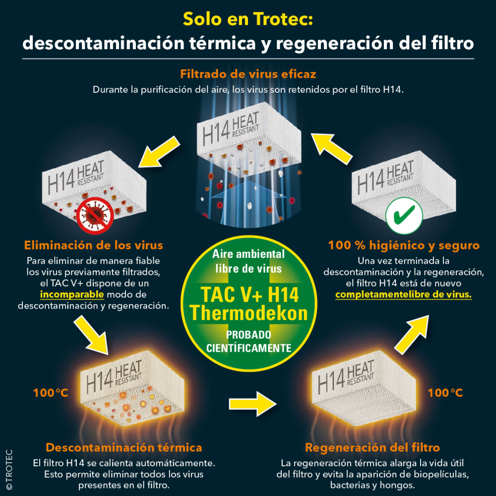 Para evitar una concentración de los virus en el filtro y que vuelvan a liberarse los patógenos que se habían separado, el TAC V+ dispone de un novedoso filtro HEPA® H14 Heat Resistant (certificado según EN 1822). Este filtro especial desarrollado por Trotec se calienta regularmente a 100 °C para eliminar de forma fiable los virus y gérmenes. Solo así es imposible que los virus infecciosos vuelvan a acabar fuera del filtro y en el aire ambiente. Mediante la descontaminación térmica del filtro se garantiza que el aparato no se convierta él mismo en una «centrifugadora de virus».