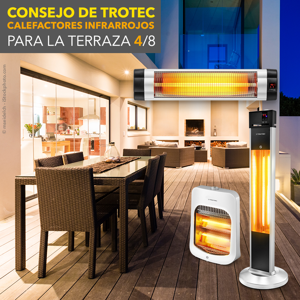 Con ambas versiones puede prolongar sus «cortas vacaciones» en la terraza, puesto que todos los radiadores infrarrojos de Trotec le ofrecen un agradable calor. Pero lo mejor antes de escoger el diseño es planear cómo y dónde va a utilizarse el calefactor en la terraza para que ofrezca la máxima efectividad posible. Por ejemplo, ¿su terraza dispone de un espacio fijo para sentarse donde suele acomodarse junto con su familia y amigos? Entonces a lo mejor le conviene un calefactor por infrarrojos de montaje fijo. ¿O prefiere ser más flexible, cambiar de vez en cuando la disposición de muebles de la terraza y además no prescindir de su radiador infrarrojo en el jardín de invierno o en la caravana al acampar? De acuerdo, en ese caso calefactor de pie móvil sería probablemente su mejor solución.