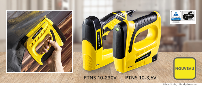 Les deux nouveaux pistolets agrafeurs de Trotec offrent une cadence d’agrafage élevée, une puissance d’agrafage convaincante et des possibilités d’utilisation des plus diverses. Grâce au pistolet agrafeur PTNS 10-230V et au pistolet agrafeur à batterie PTNS 10-3,6V, vous pouvez fixer en toute fiabilité des films plastiques, des tissus, du bois, du carton ou du cuir sur des surfaces en bois souple. C’est à vous de décider lequel de nos nouveaux outils convient le mieux à vos exigences. Le meilleur ? Commandez-le d’ici la fin de la semaine calendaire 42 et vous profiterez d’un rabais de 50 % !
