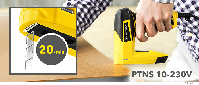 Que ce soit sur le chantier ou dans l’atelier, à la maison ou en location chez les voisins, les professionnels, tout comme les bricoleurs, apprécient la fixation rapide et fiable de films, tissus, bois, carton ou cuir sur du bois que leur offre le PTNS 11‑230V enfin disponible. Grâce à la performance de son puissant moteur de 45 W et à sa simplicité d’utilisation, notamment du fait de sa taille compacte et de son faible poids, ce pistolet agrafeur exemplaire de Trotec s’approprie aux projets de décorations et de fixation les plus divers de manière flexible. Et le mieux dans tout cela : pour pouvoir s’atteler immédiatement à la tâche, 200 agrafes de type 53 et 100 clous de type 47 sont inclus !