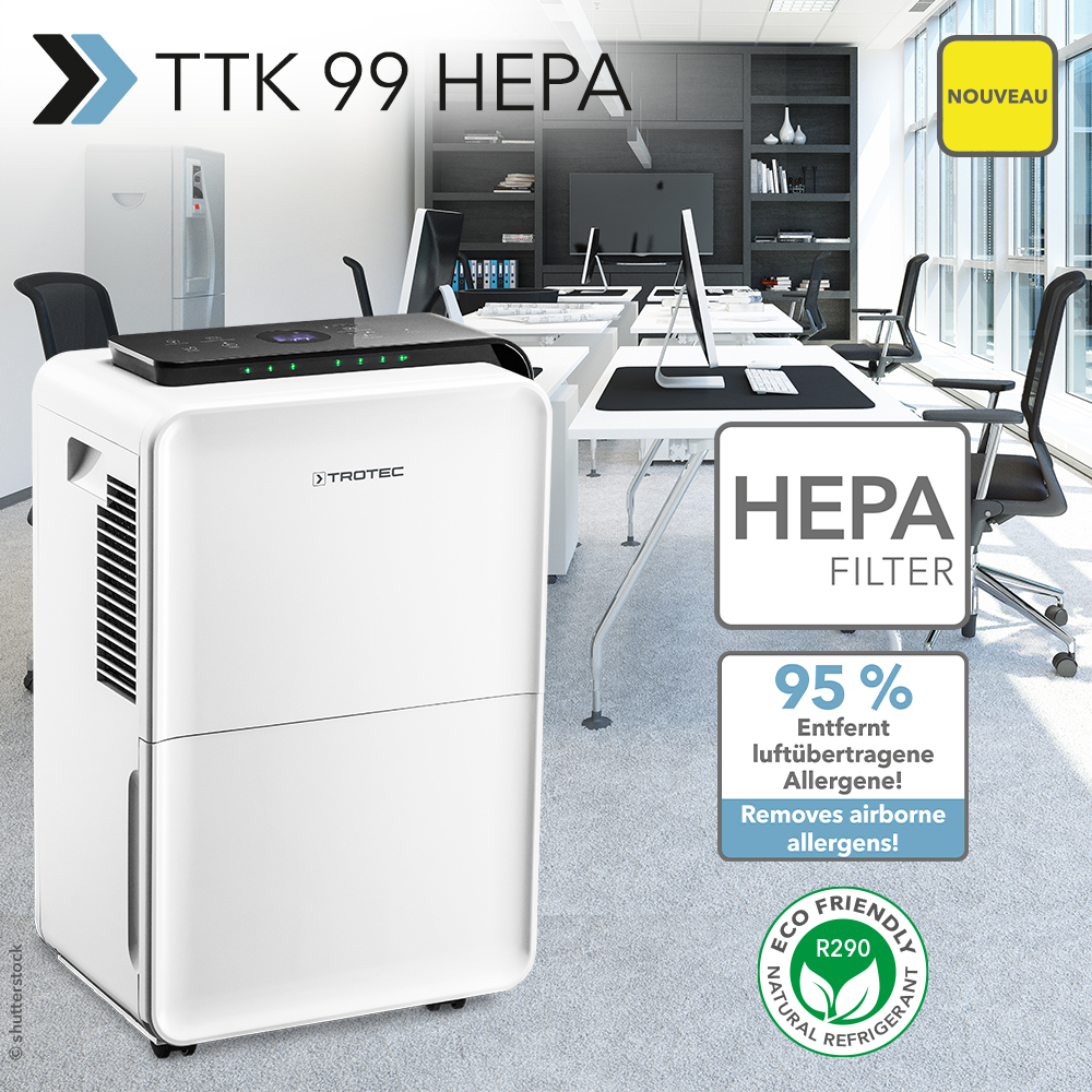 Deux questions très actuelles : comment expulser l’air humide de l’automne de mon habitation ou de mon bureau avant que des moisissures nocives ne prolifèrent ? Et comment puis-je me débarrasser des agents pathogènes tels que les virus, les bactéries, ainsi que d’autres particules pathogènes en suspension présentes dans mes pièces, compte tenu des vagues de coronavirus et de grippe à venir ? La solution se trouve dans le nouveau TK 99 HEPA : c’est le plus puissant de sa catégorie et il allie deux technologies extrêmement efficaces d’optimisation de l’air ambiant : la déshumidification automatique de l’air commandée par hygrostat et la purification de l’air via filtre HEPA.