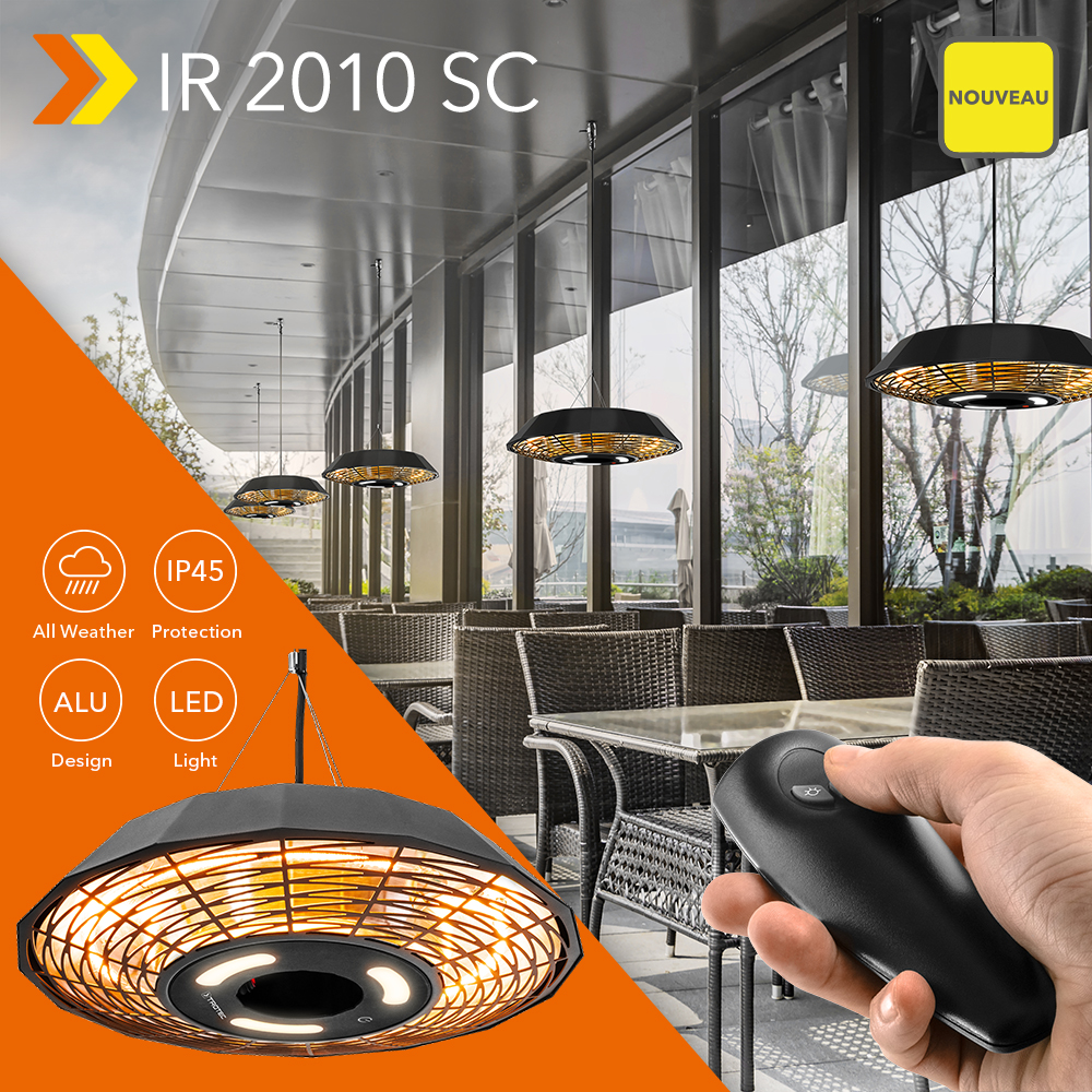 NOUVEAU Chauffage radiant suspendu IR 2010 SC : fournit de la chaleur et de la lumière en extérieur grâce à un éclairage à LED intégré – enfin disponible