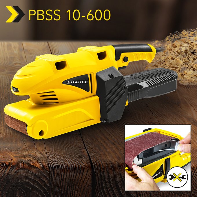 La ponceuse à bande professionnelle est l’auxiliaire idéal pour le ponçage, le lissage, le nettoyage et l’ébavurage rapides et de grande surface du bois, du plastique ou du métal – ainsi que pour dérouiller. Vous faites le bon choix avec la PBSS 10-600 de Trotec, qui est à nouveau disponible, car vous bénéficiez de la qualité de la marque avec un équipement complet à un prix attractif. La ponceuse à bande est équipée d’un puissant moteur de 600 W comprenant un système de transfert de force parfait qui, en combinaison avec sa large bande abrasive ainsi que son design sophistiqué, permet un retrait de matières important, uniforme et précis sur de grandes surfaces.