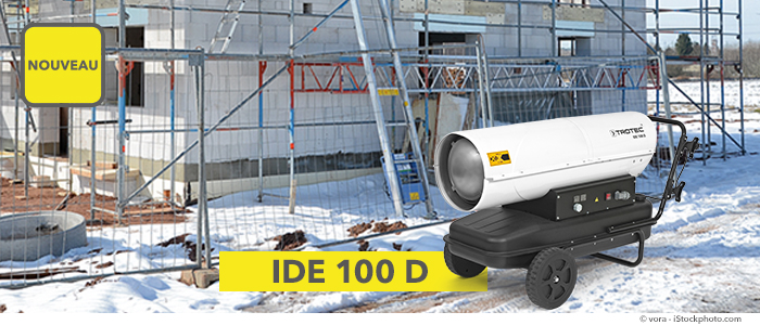 *l’expression « bien plus encore » décrit parfaitement et brièvement les nombreuses possibilités d’utilisation de notre nouveau chauffage au fioul IDE 100 D. Qu’il s’agisse de maintenir au chaud des zones de chantier, de chauffer avec efficacité de grands halls, de protéger du froid les troupeaux de bétail ou d’éviter aux équipements de travail de geler malgré un grand froid – la puissance de chauffe directe de 100 kW de ce chauffage professionnel vous offre pour chaque application une capacité de chauffage élevée dont le niveau de rendement atteint 100 %.