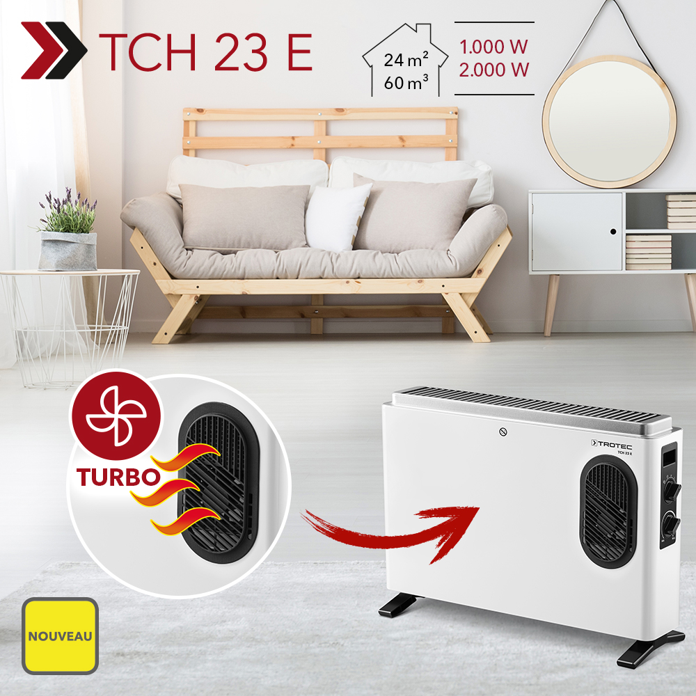 Nous résistons désormais – à l’envolée des prix du pétrole et du gaz. En effet, grâce au nouveau convecteur TCH 23 E enfin disponible, nous avons la solution adéquate pour récupérer les coûts de chauffage galopant. Il vous suffit de le mettre en marche, de régler la température et de profiter d’une chaleur agréable, même en vitesse turbo selon le besoin. Sa commande par thermostat intelligente régule la température ambiante de manière automatique, réduisant ainsi la consommation d’électricité au minimum. Il s’avère optimal pour fournir une agréable chaleur aux pièces et espaces de travail qui ne sont que rarement utilisés ou qui ne sont pas raccordés au système de chauffage central.