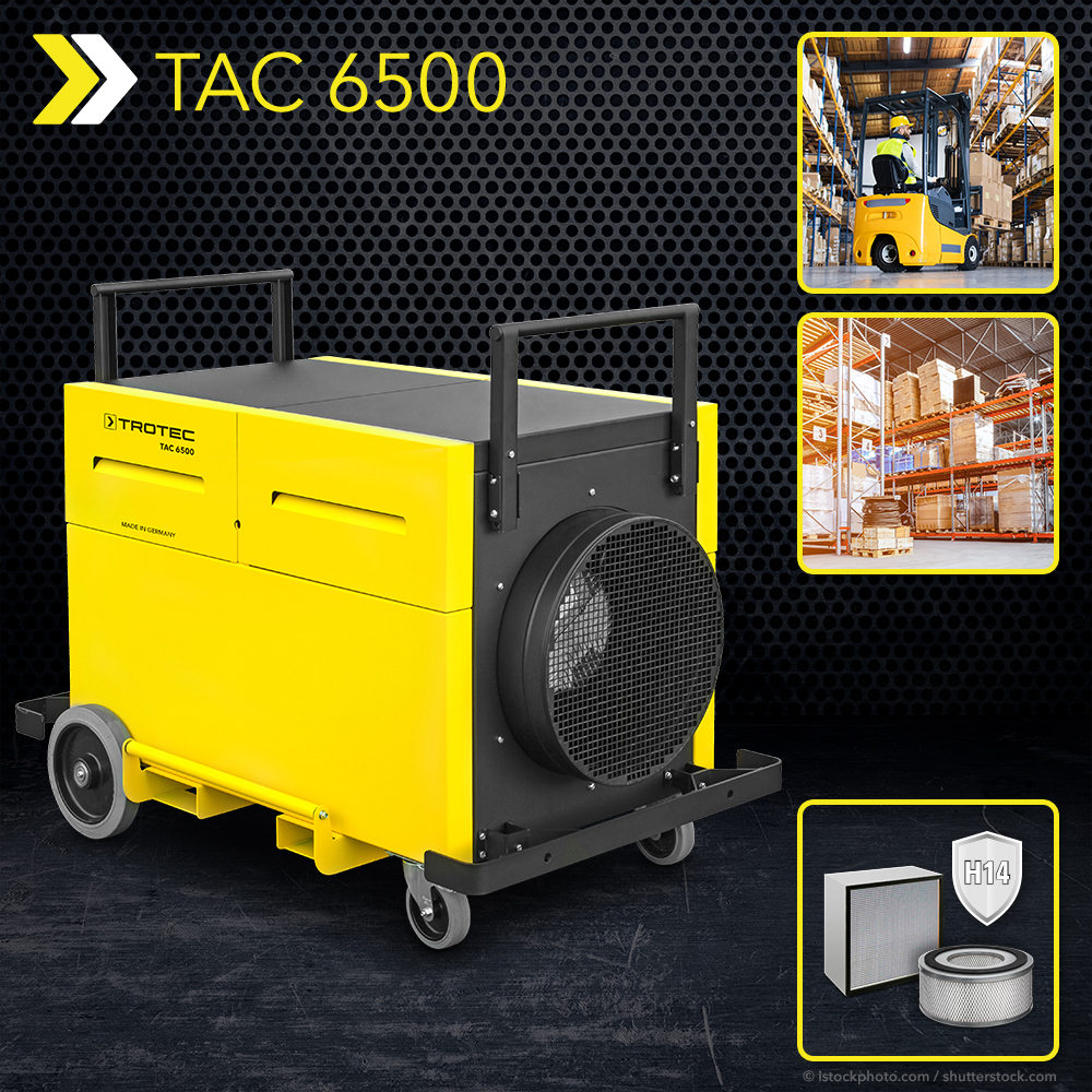 Toute personne qui utilise des chariots élévateurs dans des sites de productions ou des entrepôts pour le transport et la manutention aime surtout entendre le puissant ronronnement de ces agiles machines. Cependant, les allers-retours laissent des traces : la saleté et la poussière qui tourbillonnent dans l’air, en particulier les fines particules provenant de l’abrasion des pneus, peuvent endommager l’entraînement électrique du chariot électrique et sensiblement diminuer sa durée de vie. La solution : le très puissant purificateur d’air TAC 6500 professionnel assure de manière fiable une purification efficace de l’air, même dans les grands espaces.