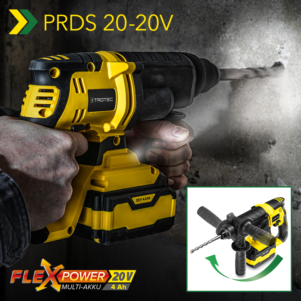 La pépite parmi les marteaux perforateurs de ce monde est à nouveau disponible : le marteau perforateur PRDS 20‑20V. Avec la combinaison d’une force d’impact mobile de 2,0 joules ainsi qu’une fréquence d’impact élevée de 5 000 coups par minute. Avec toute la puissance de sa batterie lithium-ion de 20 V et 4 Ah – sans autodécharge ni effet de mémoire. La régulation continue du régime et de la frappe du marteau perforateur sans fil permet donc d’adapter la puissance de frappe et la vitesse à la dureté du matériau à traiter. Comprenant 3 forets SDS fournis ainsi que le prix imbattable d’un outil de qualité de marque Trotec.