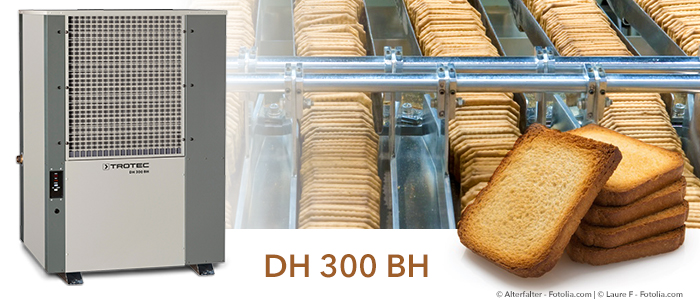 Pour les boulangeries industrielles, un des appareils les mieux adaptés est le déshumidificateur industriel DH 300 BH. Ce modèle à capacité de déshumidification max. de 520 litres en 24 heures est utilisable jusqu’à 70 °C. Son système de déshumidification fermé et sa simplicité d’utilisation garantissent une manipulation aisé et une protection extrêmement efficace contre l’humidité.