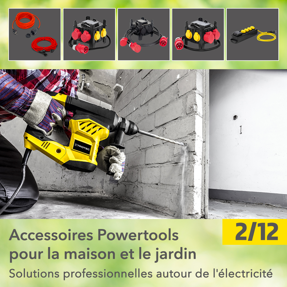 Aujourd’hui nous allons parler des accessoires souvent sous-estimés des Powertools : le câble de rallonge soi-disant basique et le distributeur de courant mobile professionnel ou le bloc multiprise. Souvent, ce n’est que juste avant de commencer le travail prévu que l’on se rend compte de leur absence… C’est-à-dire trop tard ! Avant leur utilisation, vérifiez donc que vos appareils électriques sont bien équipés de tous de leurs accessoires. D’ailleurs, ni les câbles de rallonge ni les distributeurs de courant mobiles de Trotec ne sont vraiment basiques : ces outils professionnels robustes vous permettent d’augmenter la portée d’utilisation de vos outils électriques. Par ailleurs, ils sont tous protégés contre les projections d’eau selon l’indice de protection IP44 (multiprise : indice de protection IP54) et conviennent ainsi pour les travaux de chantier ou de jardin.