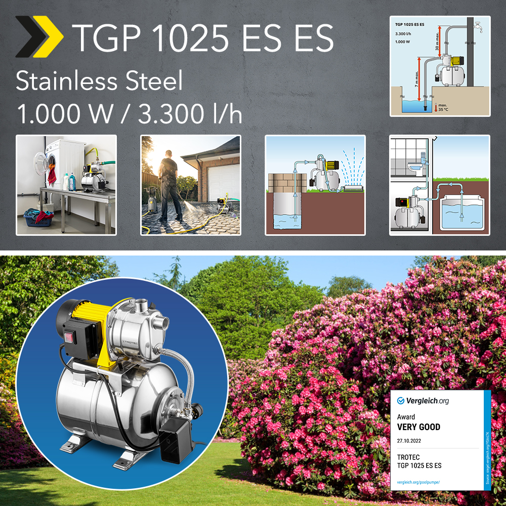 Nous savons tous que seules quelques-unes des applications utilisant de l’eau à la maison requièrent de l’eau potable. Pour la machine à laver et la chasse d’eau des toilettes, pour les travaux de nettoyage et l’arrosage du jardin, de l’eau de pluie économique, un prélèvement d’eau depuis une fontaine ou un cours d’eau dans le jardin peuvent généralement suffire. Si vous pensez que voilà une occasion de faire de grandes économies, vous avez tout à fait raison – et d’autant plus si vous misez sur le surpresseur domestique TGP 1025 ES ES à nouveau disponible pour l’exploitation de cette eau sanitaire alternative. Car cet appareil impressionne par une forte puissance de pompage et sa version presque entièrement en inox qui le protège contre la corrosion de manière fiable.