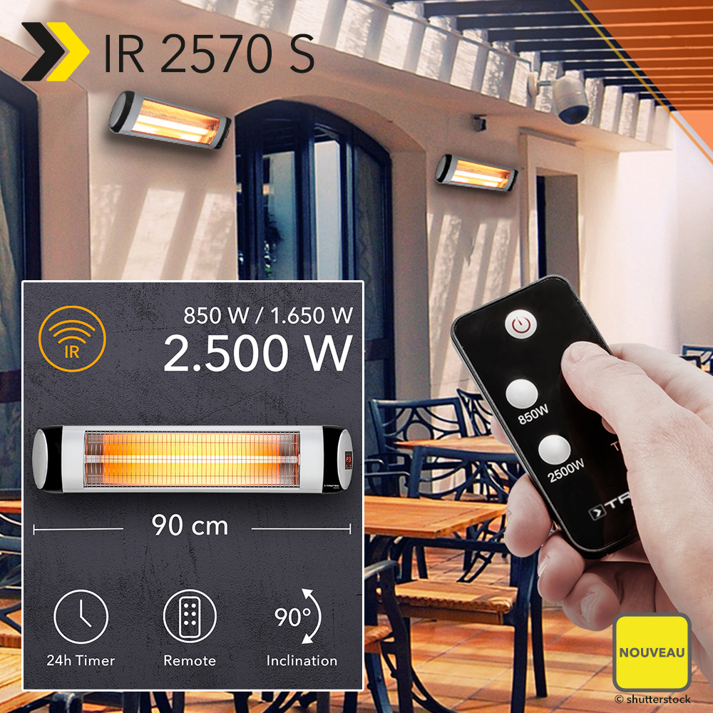 Qui a dit qu’on ne pouvait pas faire de sa terrasse ou de son balcon une oasis de bien-être pendant les soirées fraiches ? Et les transformer en prolongement du séjour toute l’année durant ? Le nouveau chauffage radiant infrarouge IR 2570 S produit sur simple pression d’un bouton une chaleur immédiate bienfaisante grâce à ses 2500 Watt. Et l’angle d’inclinaison réglable sur 90° assure des places assises agréablement tempérées dans les extérieurs couverts, même dans la restauration d’ailleurs. L’équipement confort du chauffage radiant est complété par une télécommande et une fonction minuterie. Entre autres !